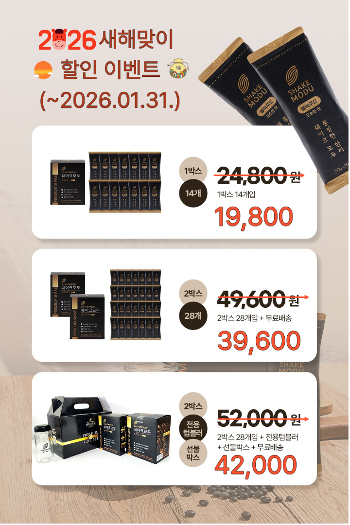 추운겨울 따듯한 쉐이크모두 한잔이면마음도 몸도 포근해집니다.국산 블랙푸드의 영양까지 가득 담아프리미엄 블랙푸드 선식 "쉐이크모두"